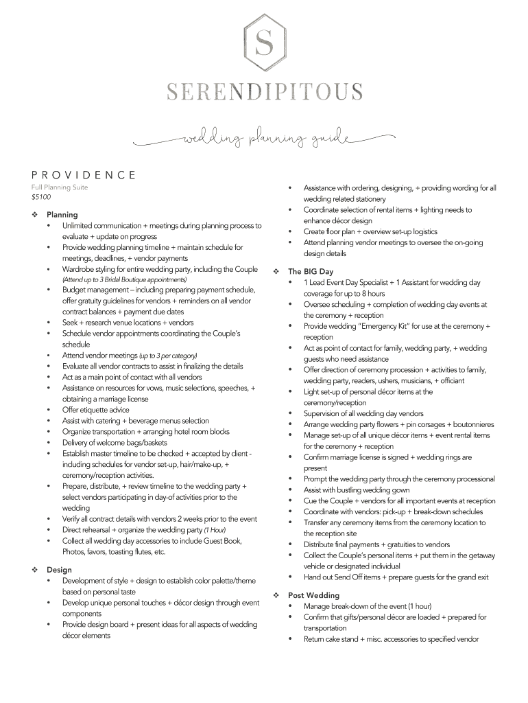 Wedding planning guide P R O V I D E N C E Full Planning Suite $5100! Planning Unlimited communication + meetings during planning process to evaluate + update on progress Provide wedding planning