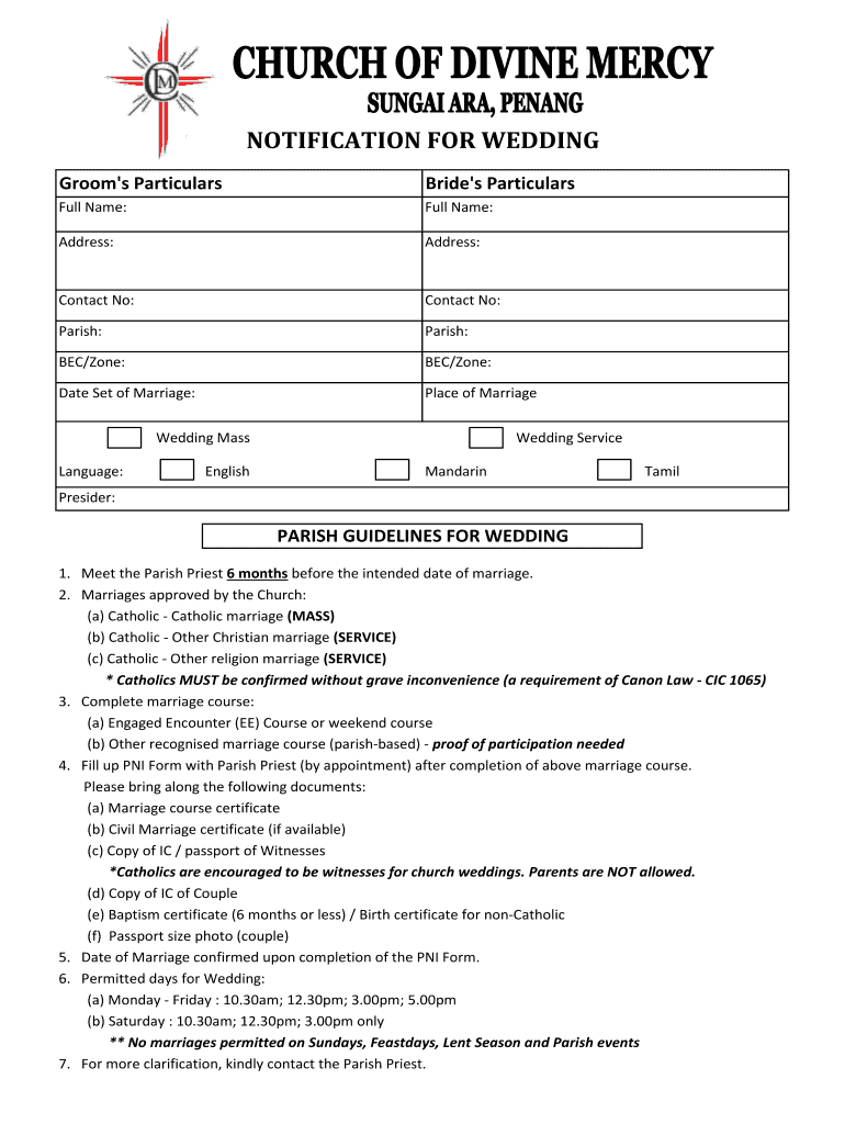 NOTIFICATION FOR WEDDING Groom's ParticularsBride's ParticularsFull Name:Full Name:Address:Address:Contact No:Contact No:Parish:Parish:BEC/Zone:BEC/Zone:Date Set of Marriage:Place of MarriageWedding