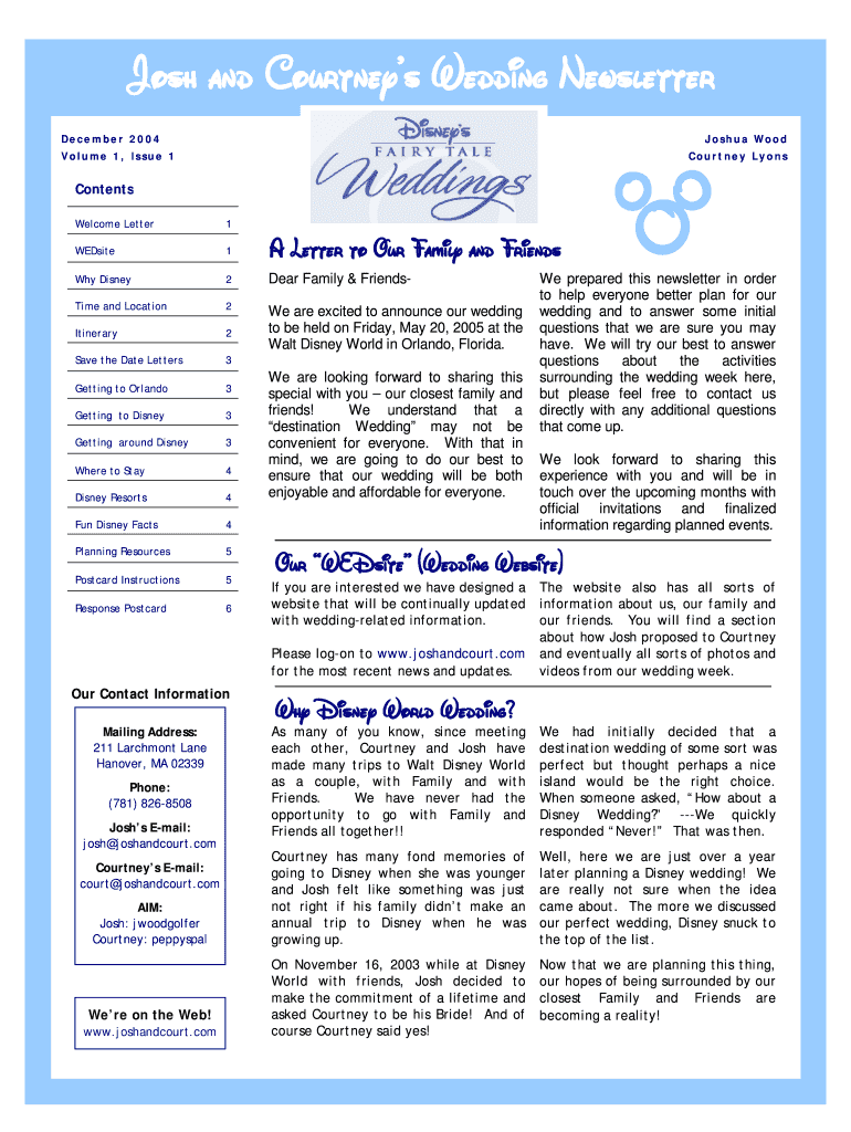 Josh and Courtney's Wedding Newsletter Joshua Woo dance be r 2004 Volume 1, Is sue 1Contents Welcome Letter1WEDsite1A Letter to Our Family and Friends Disney2Dear Family & Friendship and Location2Itinerary2Save