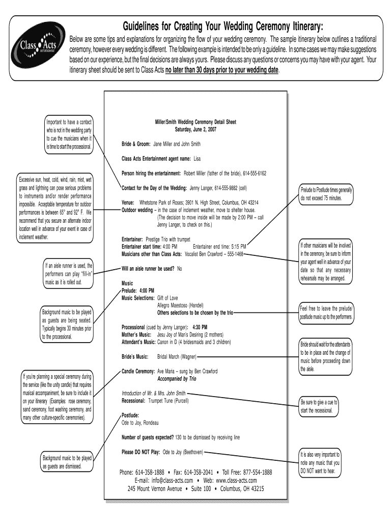 Guidelines for Creating Your Wedding Ceremony Itinerary:Below are some tips and explanations for organizing the flow of your wedding ceremony. The sample itinerary below outlines a traditional