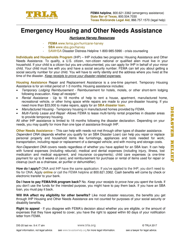 FEMA helpline, 800.621.3362 (emergency assistance) State Bar of Texas, 800.504.7030 Texas Rio Grande Legal Aid, 866.757.1570 (legal help) Emergency Housing and Other Needs Assistance Hurricane Harvey