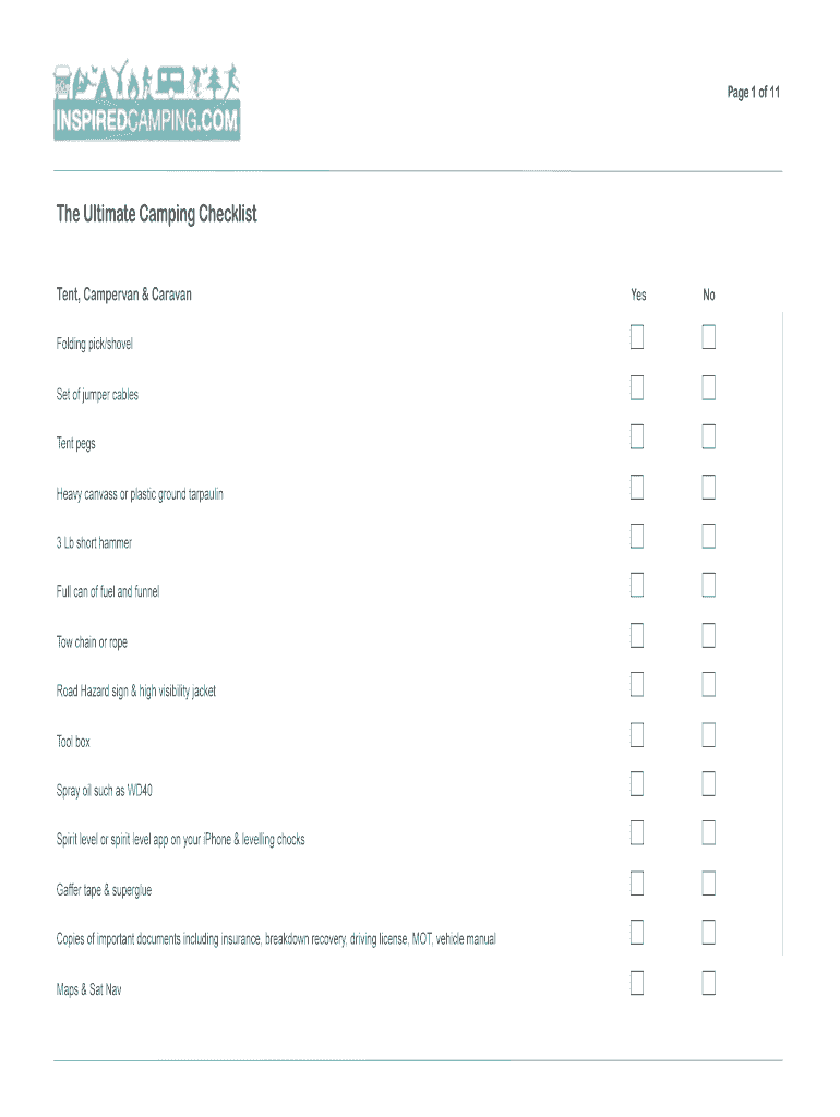 Page 1 of 11The Ultimate Camping Checklist Tent, Camper van & Caravan Folding pick/shovel Set of jumper cables Tent pegs Heavy canvass or plastic ground tarpaulin 3 Lb short hammer Full can of fuel