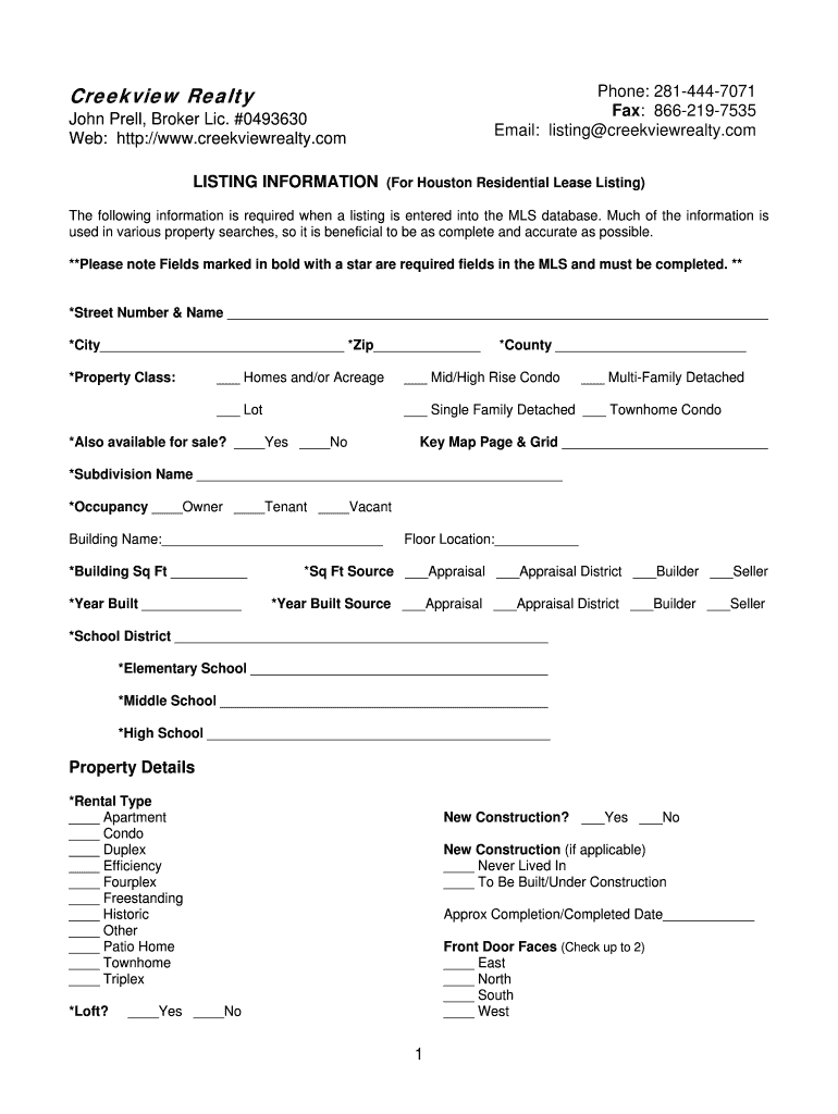 Field-by-Field Instructions for the Houston Residential Lease Listing Form