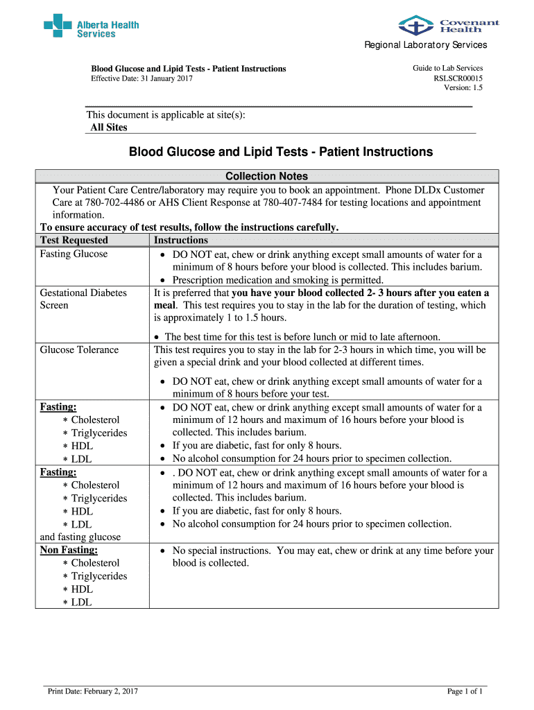 Regional Laboratory Services Blood Glucose and Lipid Tests Patient Instructions Effective Date: 31 January 2017Guide to Lab Services RSLSCR00015 Version: 1.5This document is applicable at site(s):