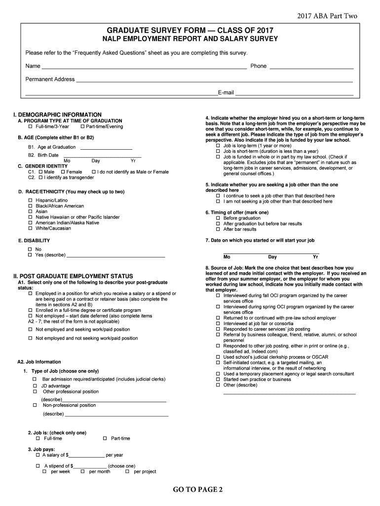2017 ABA Part Two GRADUATE SURVEY FORM CLASS OF 2017 NAP EMPLOYMENT REPORT AND SALARY SURVEY Please refer to the Frequently Asked Questions sheet as you are completing this survey. Name Phone Permanent