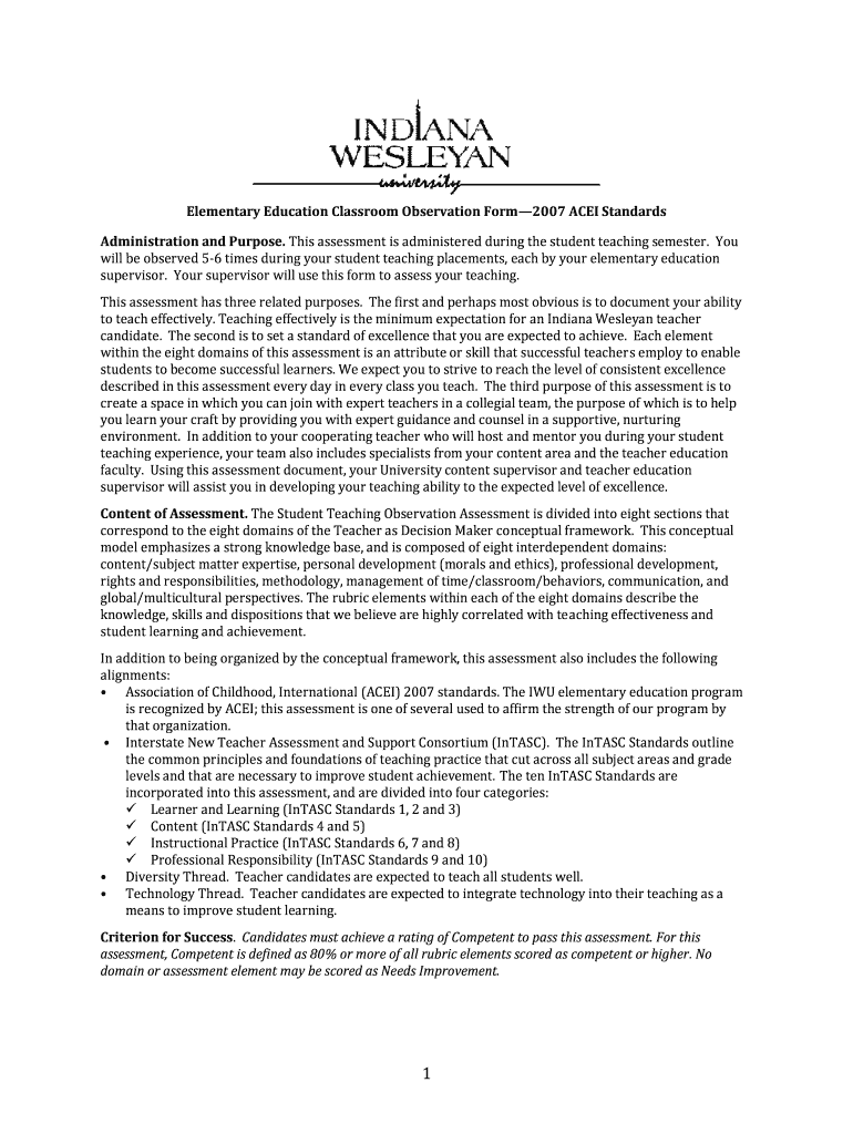 Elementary Education Classroom Observation Form2007 ACE Standards