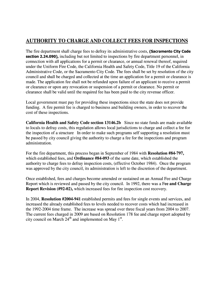The fire department shall charge fees to defray its administrative costs, (Sacramento City Code