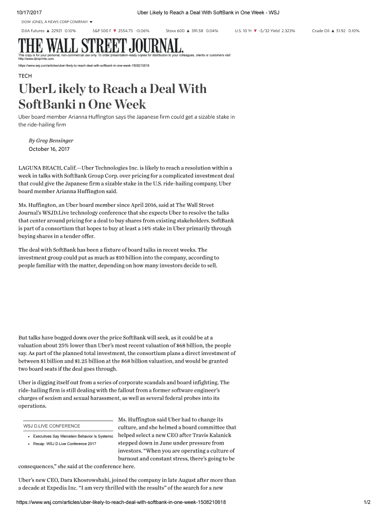 10/17/2017Uber Likely to Reach a Deal With SoftBank in One Week WINDOW JONES, A NEWS CORP COMPANYDJIA Futures 22921 0.10×S&P 500 F 2554.75 0.06×Story 600 391.58 0.04×U.S. 10 Yr 5/32 Yield 2.323×Crude