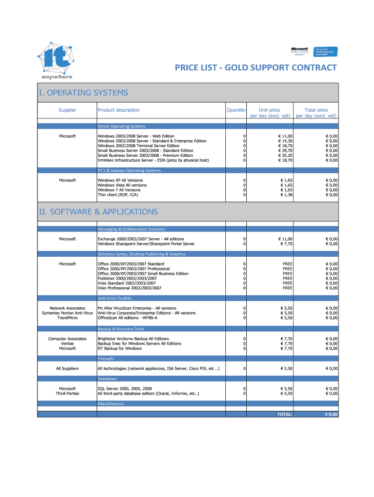PRICE LIST GOLD SUPPORT CONTRACT I. OPERATING SYSTEMS SupplierProduct descriptionQuantityUnit price per day (excl. vat)Total price per day (excl. vat)Server Operating Systems Microsoft Windows 2003/2008