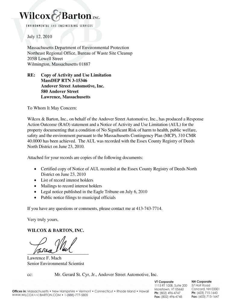 July 12, 2010, Massachusetts Department of Environmental Protection Northeast Regional Office, Bureau of Waste Site Cleanup 205B Lowell Street Wilmington, Massachusetts 01887 RE:Copy of Activity and