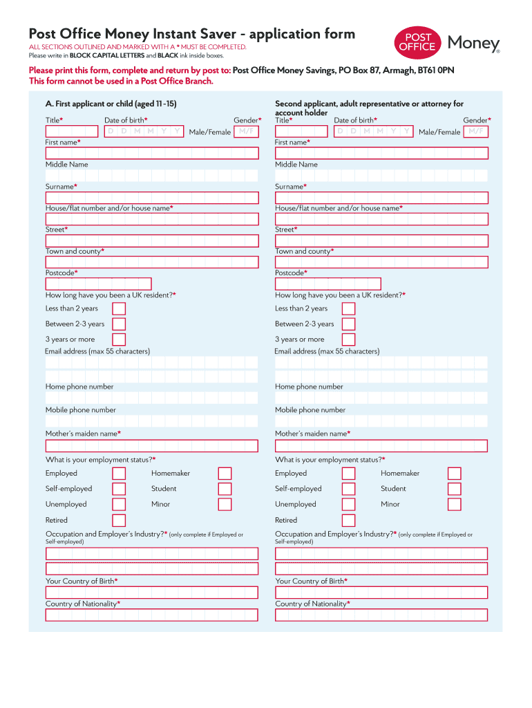 Post Office Money Instant Saver application form ALL SECTIONS OUTLINED AND MARKED WITH A * MUST BE COMPLETED. Please write in BLOCK CAPITAL LETTERS and BLACK ink inside boxes. Please print this form,