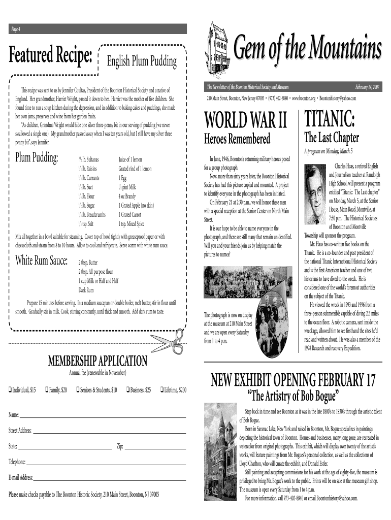 Page 4Featured Recipe:English Plum Puddings recipe was sent to us by Jennifer Courts, President of the Boon ton Historical Society and a native of