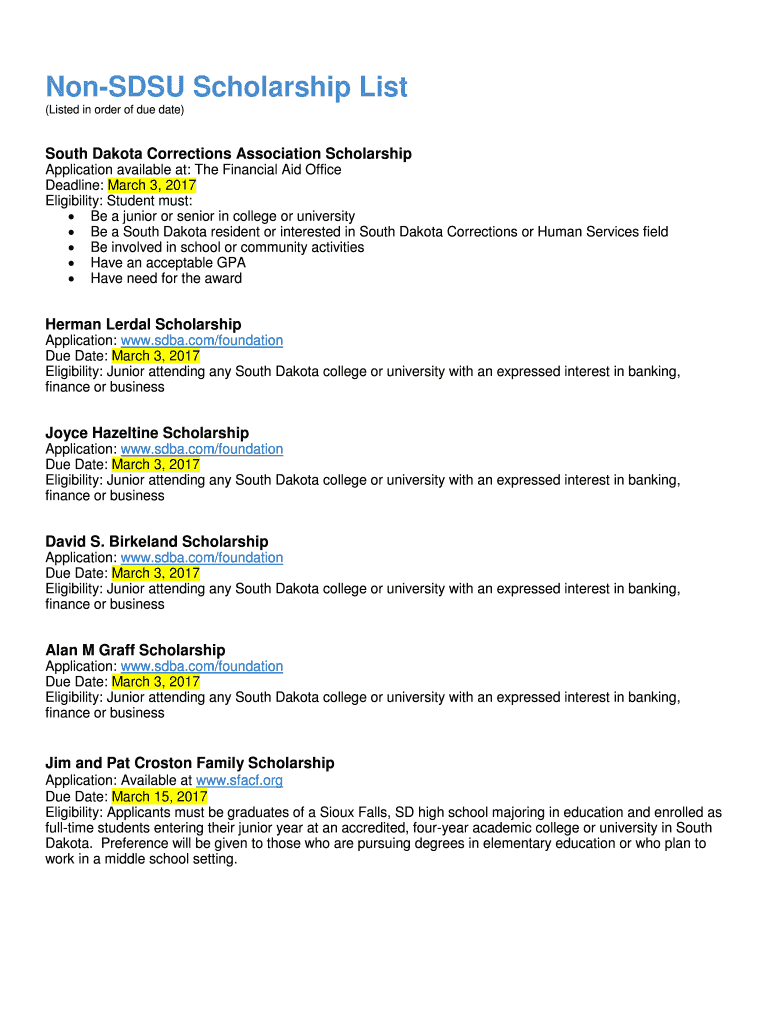 Bonds Scholarship List (Listed in order of due date)South Dakota Corrections Association Scholarship Application available at: The Financial Aid Office Deadline: March 3, 2017, Eligibility: Student