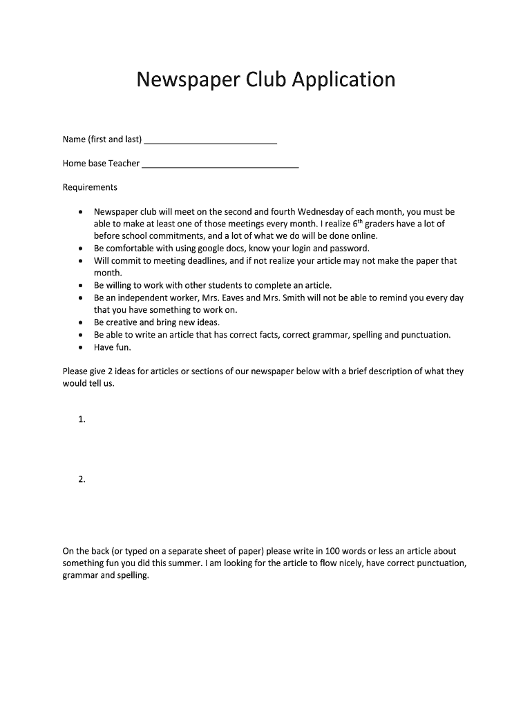 Newspaper Club Application Name (first and last) Home base Teacher Requirements Newspaper club will meet on the second and fourth Wednesday of each month, you must be able to make at least one of