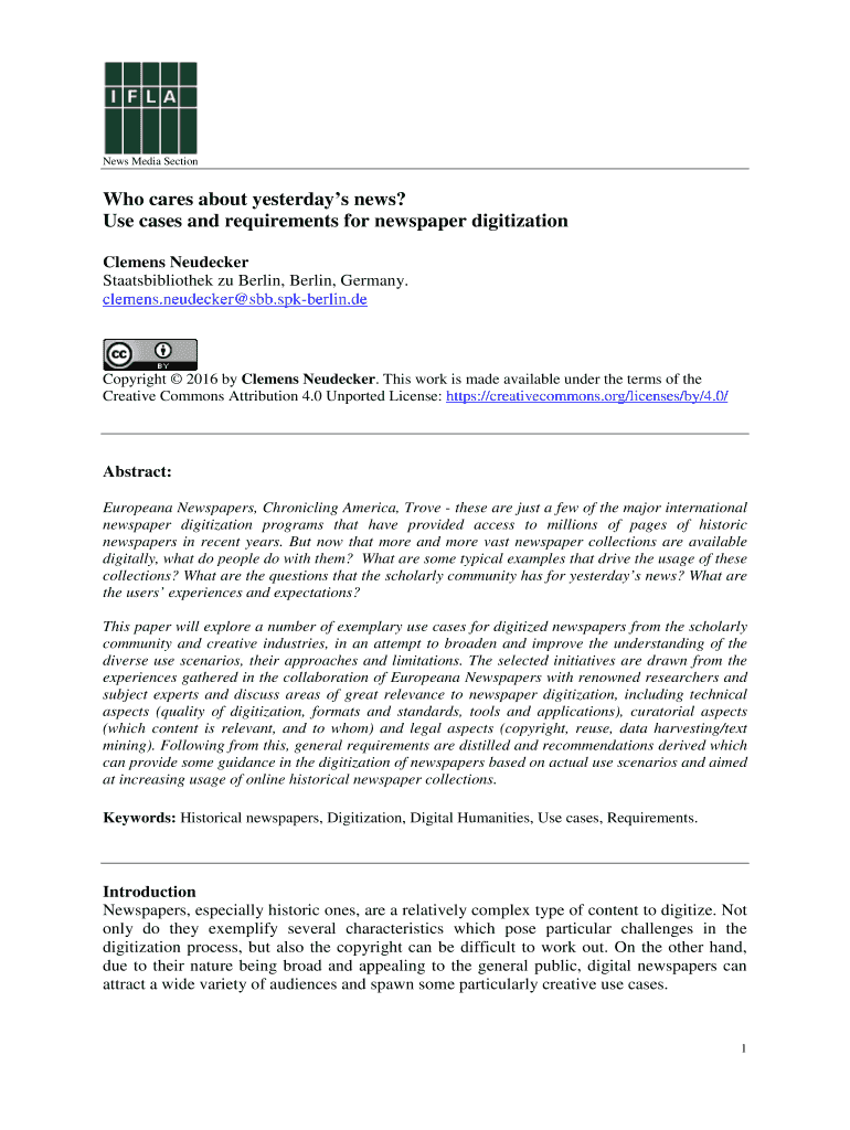 News Media Section cares about yesterday's news? Use cases and requirements for newspaper digitization Clemens Decker Staatsbibliothek EU Berlin, Berlin, Germany. Clemens. Decker SBB. Berlin.copyright