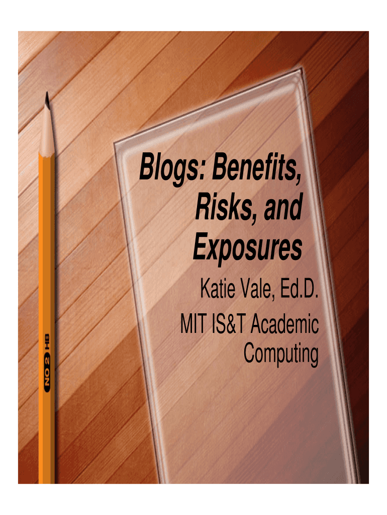 Blogs: Benefits, Risks, and Exposures Katie Vale, Ed. D. MIT ISGT Academic ComputingOverview the weblog can be a powerful tool for reflection, communication, and community building. However, blog