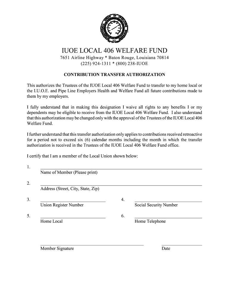 IUOE Local 406 members can fill out the welfare forms provided by the union and submit them according to the instructions provided.