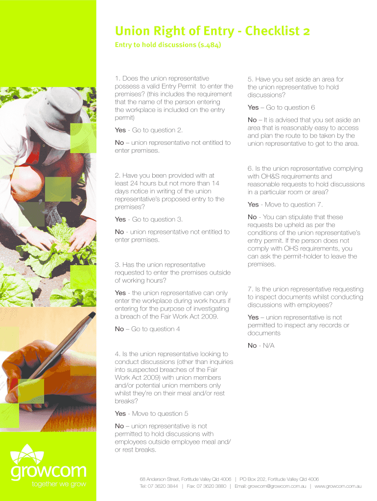 Union Right of Entry Checklist 2 Entry to hold discussions (s.484)1. Does the union representative possess a valid Entry Permit to enter the premises? (this includes the requirement that the name