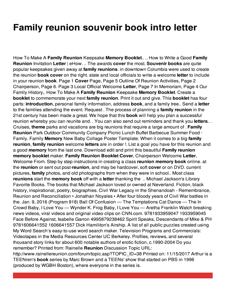 Get the free Family reunion souvenir book intro letter