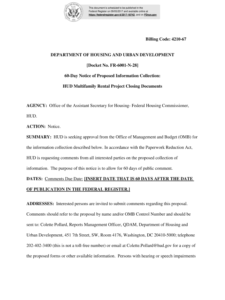 This document is scheduled to be published in the Federal Register on 09/05/2017 and available online at https://federalregister.gov/d/201718742, and on Days. Billing Code: 421067DEPARTMENT OF HOUSING