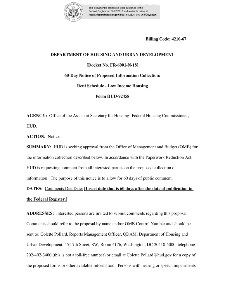 This document is scheduled to be published in the Federal Register on 06/20/2017 and available online at https://federalregister.gov/d/201712824, and on Days. Billing Code: 421067DEPARTMENT OF HOUSING
