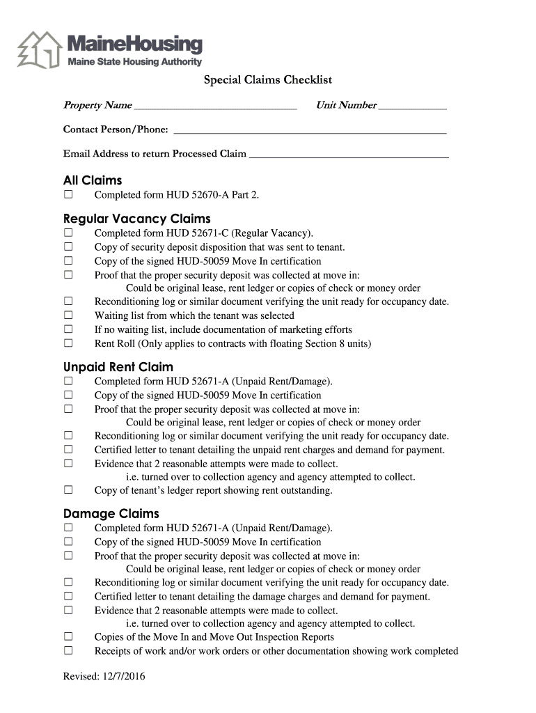 Special Claims Checklist Property Name Unit Number Contact Person/Phone: Email Address to return Processed Claim All Claims Completed form HUD 52670A Part 2. Regular Vacancy Claims Completed form