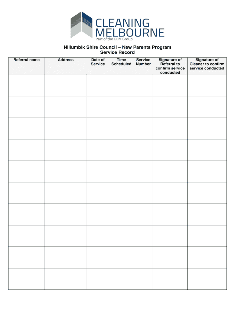 Nillumbik Shire Council New Parents Program Service Record Referral nameAddressDate of Servicemen ScheduledService NumberSignature of Referral to confirm service conductedSignature of Cleaner to confirm