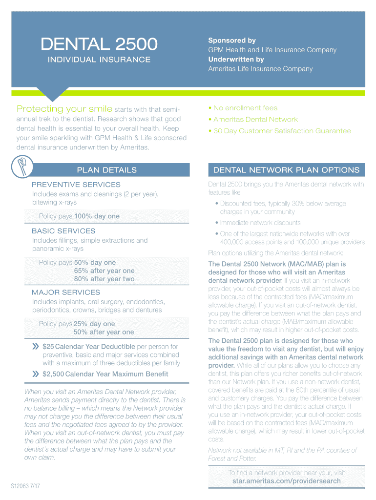 DENTAL 2500 INDIVIDUAL INSURANCESponsored by GPM Health and Life Insurance Company Underwritten by Americas Life Insurance CompanyProtecting your smile starts with that semi No enrollment fees annual