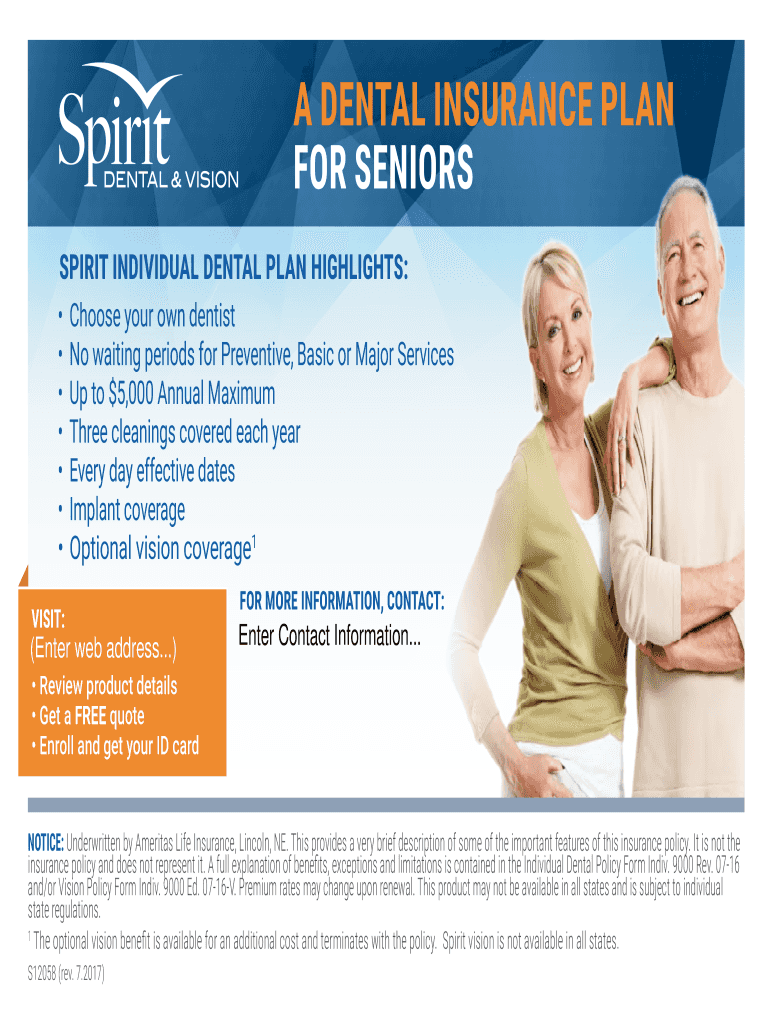 A DENTAL INSURANCE PLAN FOR SENIORS SPIRIT INDIVIDUAL DENTAL PLAN HIGHLIGHTS: Choose your own dentist No waiting periods for Preventive, Basic or Major Services Up to $5,000 Annual Maximum Three cleanings