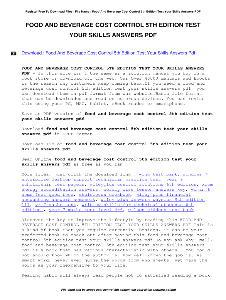 Register Free To Download Files File Name : Food And Beverage Cost Control 5th Edition Test Your Skills Answers FOOD AND BEVERAGE COST CONTROL 5TH EDITION TEST YOUR SKILLS ANSWERS PDF Download : Food