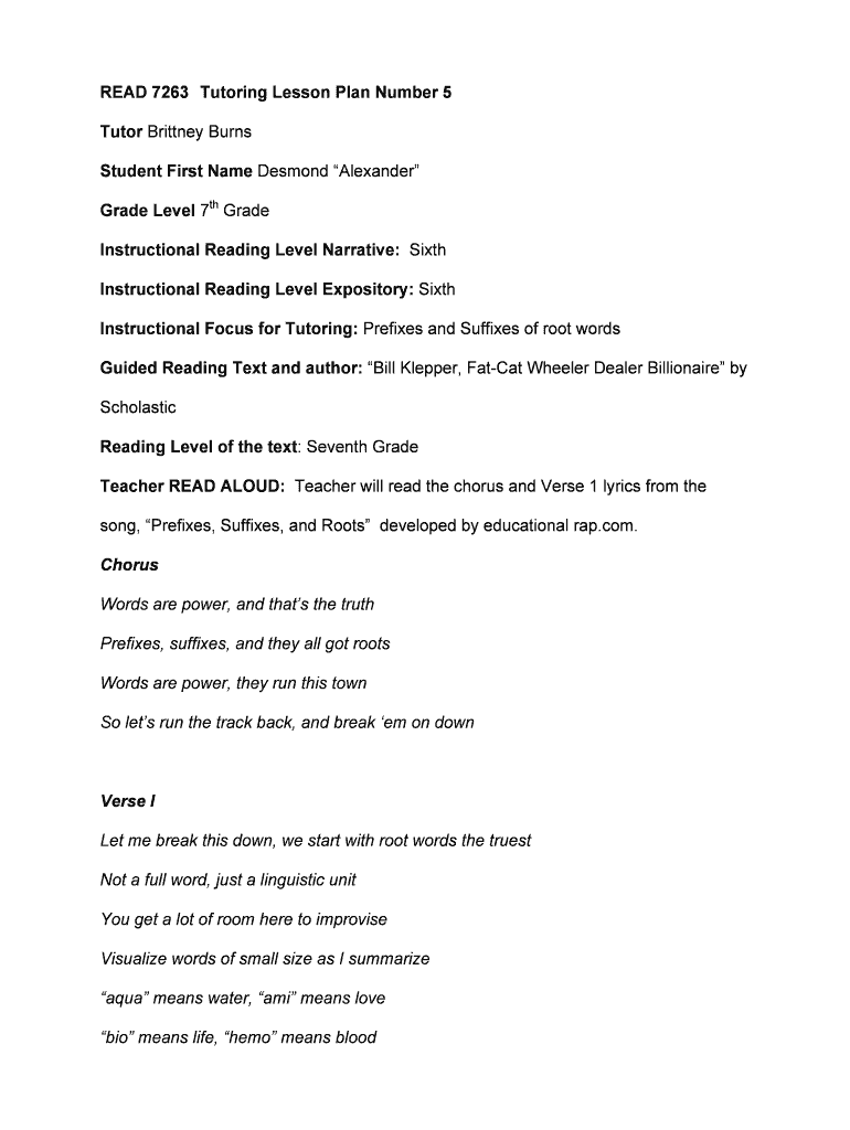 Get the free READ 7263 Tutoring Lesson Plan Number 5