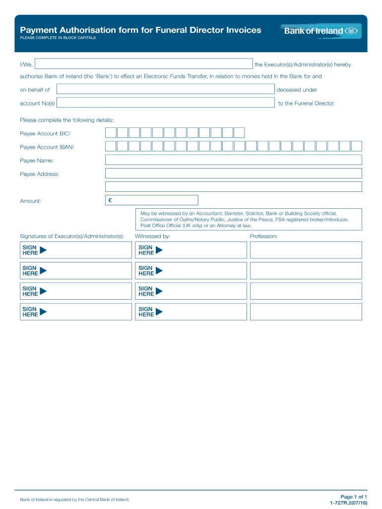 PLEASE COMPLETE IN BLOCK CAPITALS/We, the Executor(s)/Administrator(s) herebyauthorise Bank of Ireland (the Bank) to effect an Electronic Funds