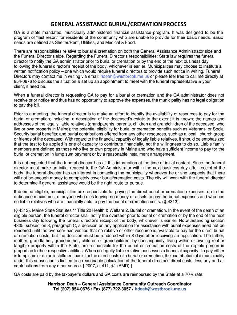 GENERAL ASSISTANCE BURIAL/CREMATION PROCESS GA is a state mandated, municipally administered financial assistance program. It was designed to be the program of last resort for residents of the community