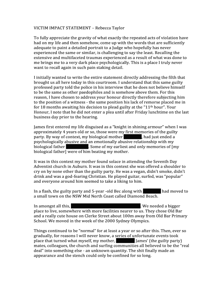 VICTIM IMPACT STATEMENT Rebecca Taylor To fully appreciate the gravity of what exactly the repeated acts of violation have had on my life and then somehow, come up with the words that are sufficiently
