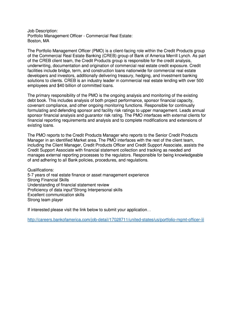 Job Description: Portfolio Management Officer Commercial Real Estate: Boston, MA The Portfolio Management Officer (PMO) is a client facing role within the Credit Products group of the Commercial Real