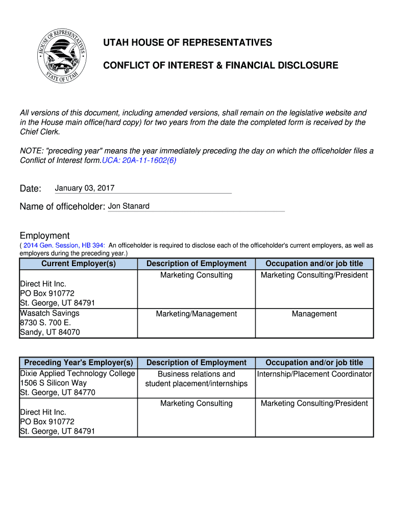 UTAH HOUSE OF REPRESENTATIVES CONFLICT OF INTEREST & FINANCIAL Disclosure versions of this document, including amended versions, shall remain on the legislative website and in the House main office(hard