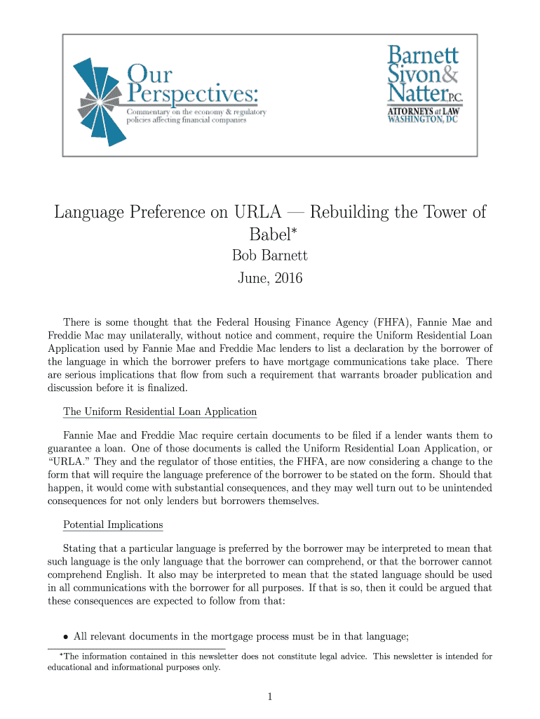Language Preference on UCLA Rebuilding the Tower of Babel Bob Barnett June 2016 There is some thought that the Federal Housing Finance Agency (FIFA), Fannie Mae and Freddie Mac may unilaterally, without