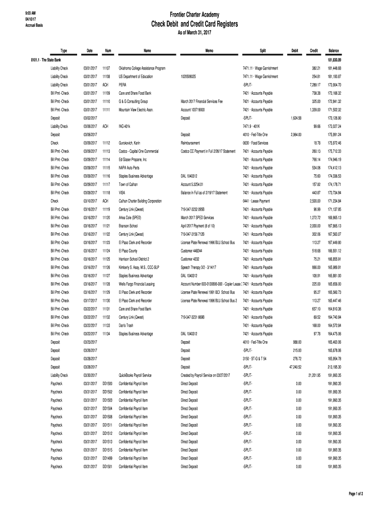 9:03 AM 04/10/17 Accrual BasisFrontier Charter AcademyCheck Debit and Credit Card Registers As of March 31, 2017 TypeDateNumNameMemoSplitDebitCredit8101.1 The State Unbalance 181,830.89Liability Check03/01/201711107Oklahoma
