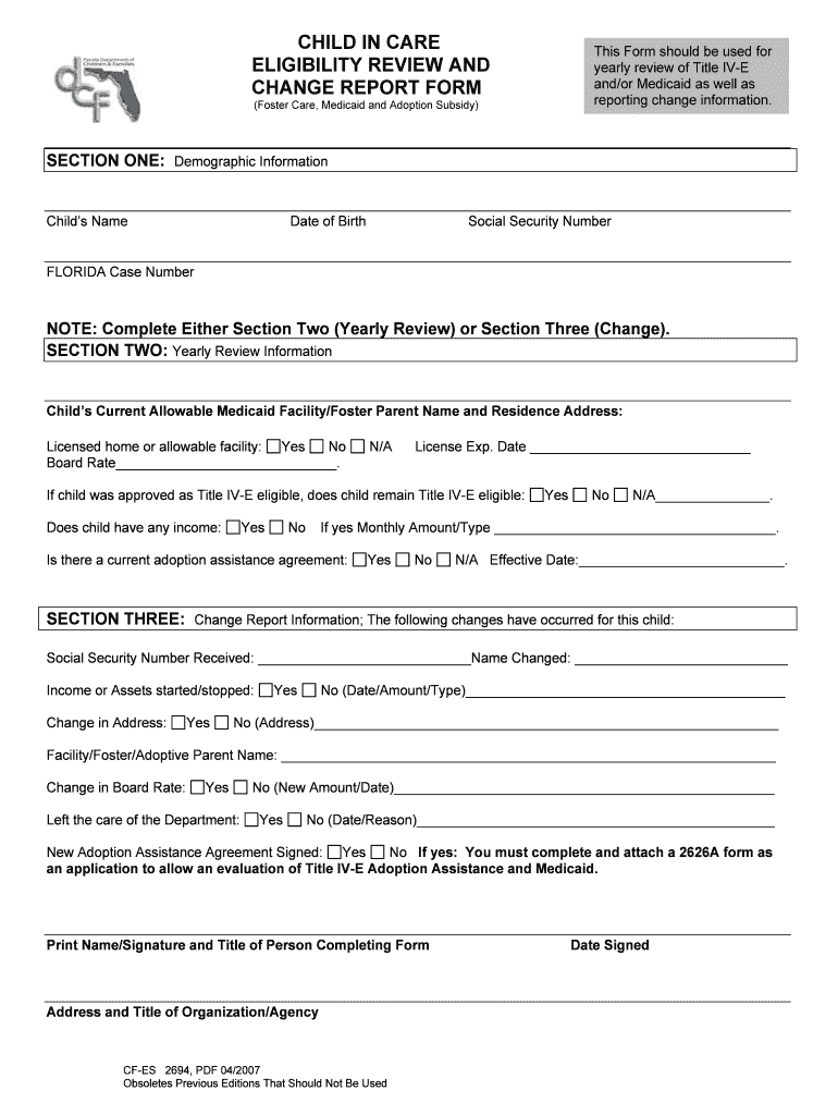 Clear CHILD IN CARE ELIGIBILITY REVIEW AND CHANGE REPORT From This Form should be used for yearly review of Title IV-E and/or Medicaid as well as reporting change information. (Foster Care, Medicaid