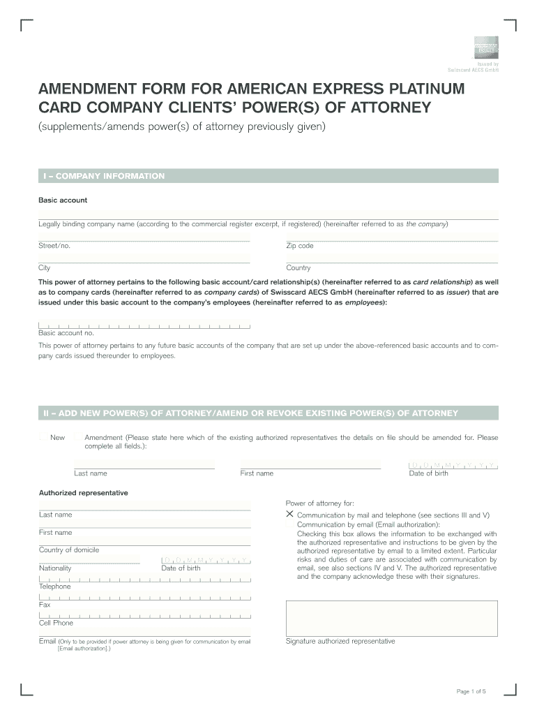 Issued by Swiss card ACS GmbHAMENDMENT FORM FOR AMERICAN EXPRESS PLATINUM CARD COMPANY CLIENTS POWER(S) OF ATTORNEY (supplements/amends power(s) of attorney previously given)I COMPANY INFORMATION