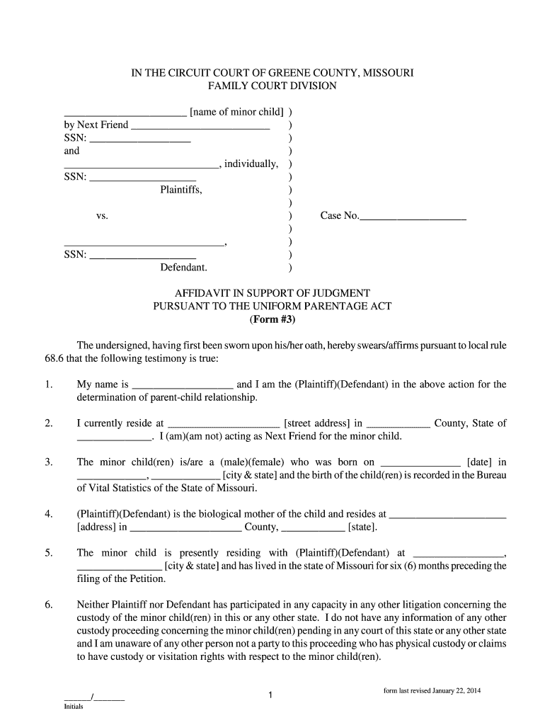 IN THE CIRCUIT COURT OF GREENE COUNTY, MISSOURI FAMILY COURT DIVISION name of minor child by Next Friend SSN: and, individually, SSN: Plaintiffs, vs., SSN: Defendant.) ))))))))))))Case No. AFFIDAVIT