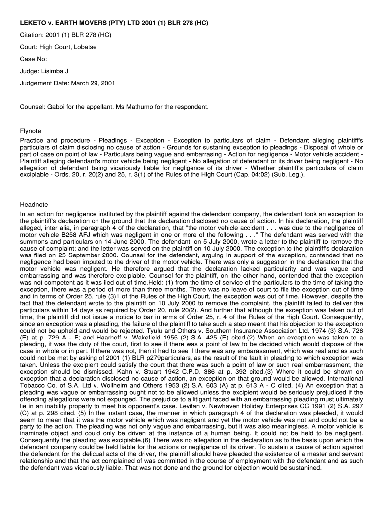 LEGATO v. EARTH MOVERS (PTY) LTD 2001 (1) BLR 278 (HC) Citation: 2001 (1) BLR 278 (HC) Court: High Court, Locate Case No: Judge: ISIMA J Judgement Date: March 29, 2001Counsel: Gabon for the appellant.