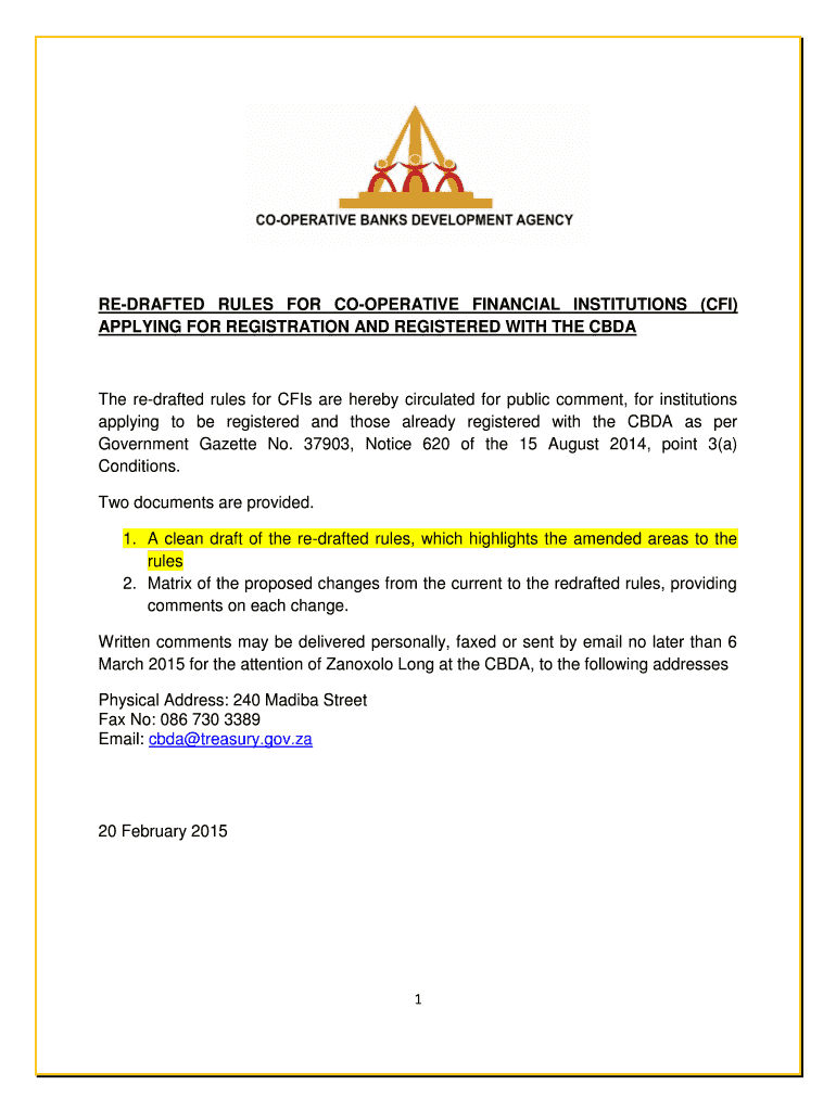 REDRAFTED RULES FOR COOPERATIVE FINANCIAL INSTITUTIONS (CFI)