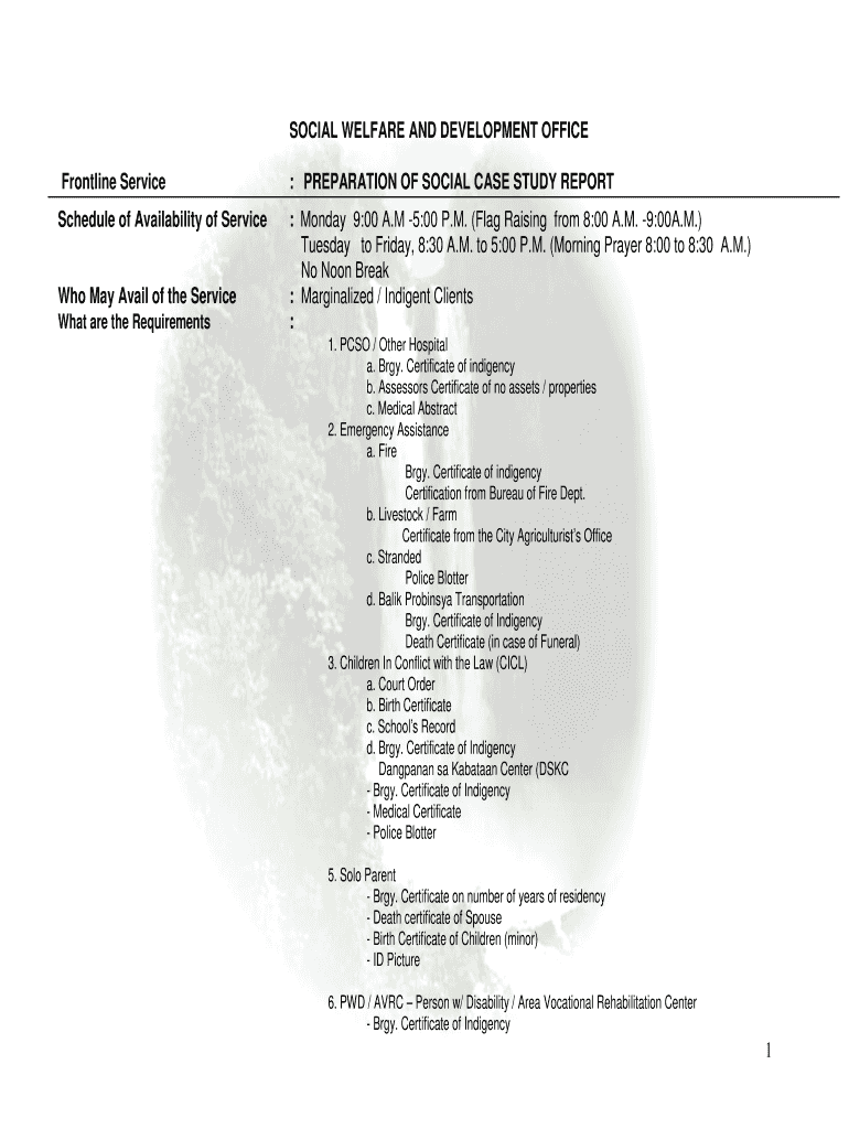 Frontline Service: PREPARATION OF SOCIAL CASE STUDY REPORTSchedule of Availability of Service: Monday 9:00 A. M 5:00 P.M. (Flag Raising from 8:00 A.M. 9:00A.