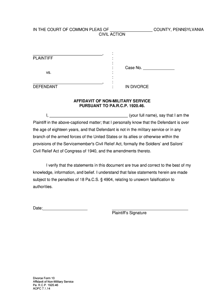 Affidavit of Nonmilitary Service Form 10Form 10 Affidavits of Nonmilitary Service Pursuant to Pa. R.C.P. 1920.46 You cannot obtain a 3301(d) divorce against an unrepresented Defendant if he/she is