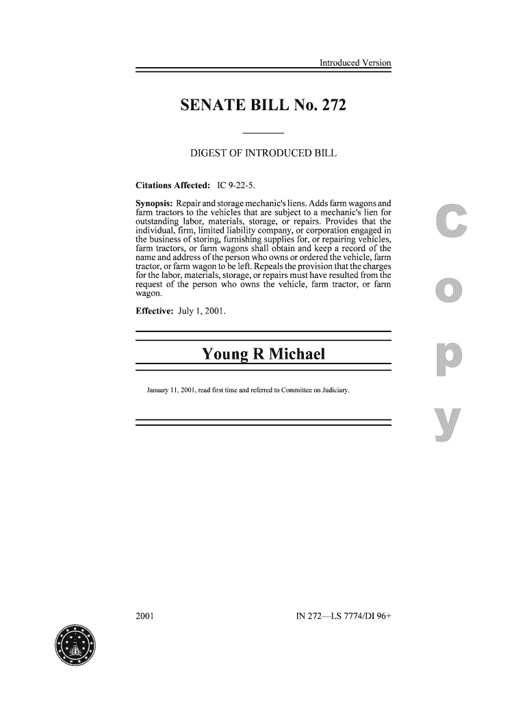 Introduced VersionSENATE BILL No. 272 DIGEST OF INTRODUCED BILL Citations Affected: IC 9225. Synopsis: Repair and storage mechanic's liens. Adds farm wagons and farm tractors to the vehicles that