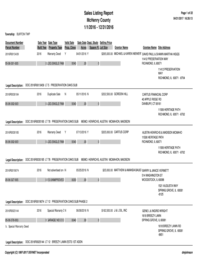Sales Listing Report McHenry County 1/1/2016 12/31/2016Page 1 of 22 04/21/2017 16:26:13Township: BURTON TWP Document Number Parcel Number Sale Year Sale Type Built Year Property Typepad Sale Date