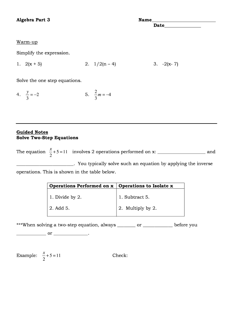 Algebra Part 3Name Date Warm up Simplify the expression. 1. 2(x + 5)2. 1/2(n 4)3. 2(x 7)Solve the one-step equations. 4.y 2 35.2 m 4 3Guided Notes Solve Twisted Equations The equation + 5 11 2involves