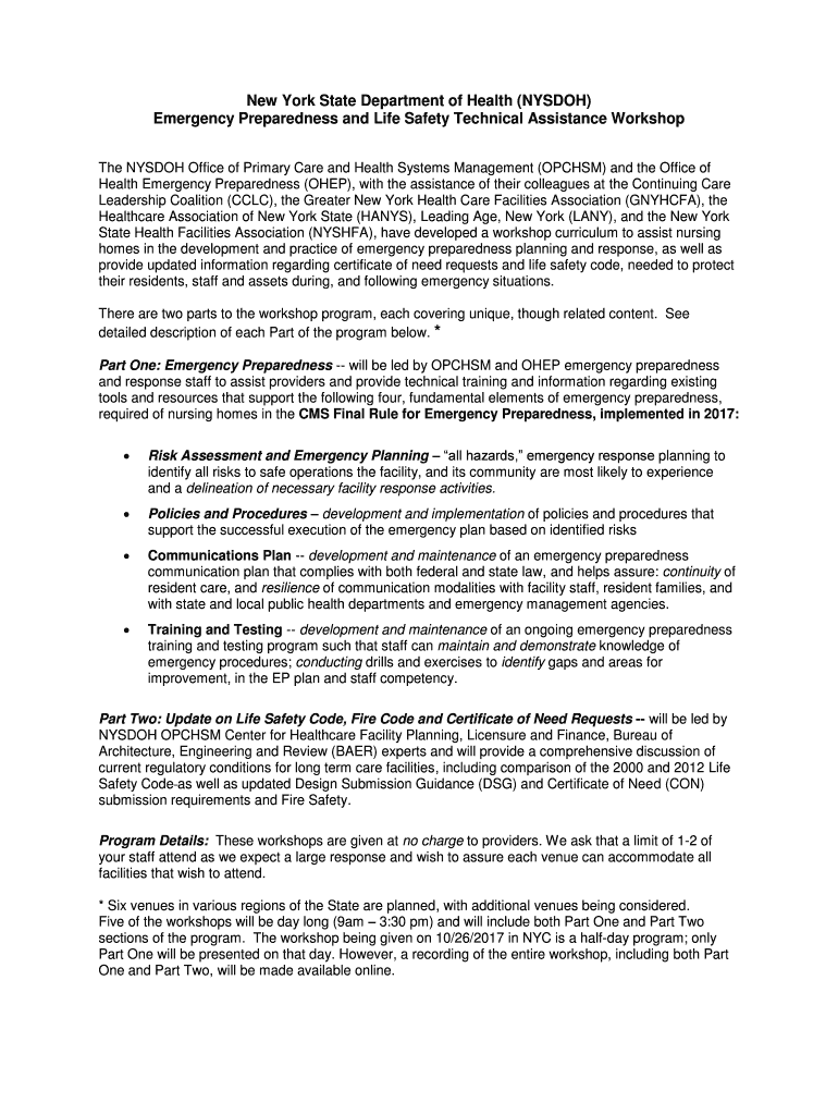 Emergency Preparedness and Life Safety Technical Assistance Workshop