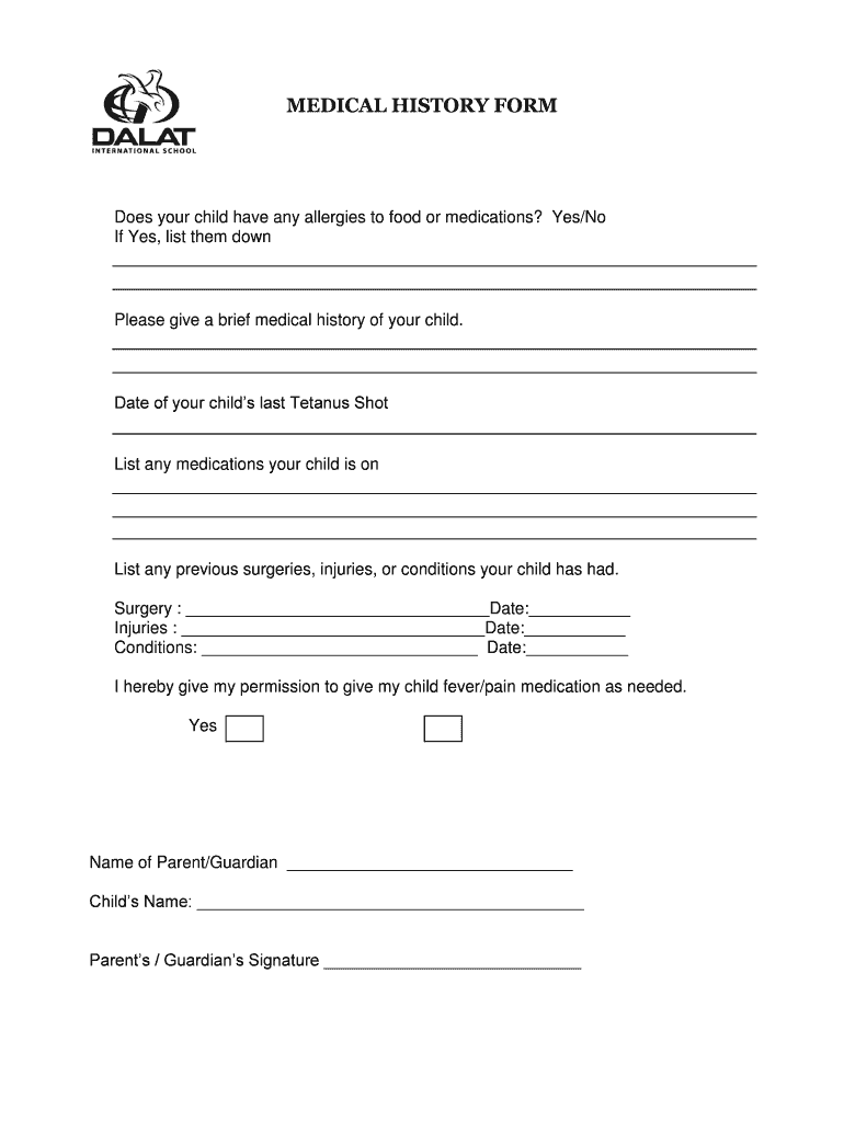 MEDICAL HISTORY Forgoes your child have any allergies to food or medications? Yes/No If Yes, list them downplayed give a brief medical history of your child. Date of your children last Tetanus Shortlist